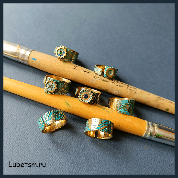 Кольца в стиле стимпанк. шестерёнки и микросхемы.. Латунь, патина, наноситалы. #metalclay #goldielemonbrass